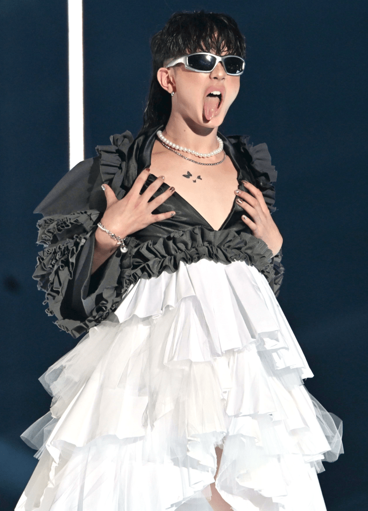For this appearance, Hikaru donned a distinctive look, pairing sporty sunglasses with brown blush and a wavy hairstyle that exuded personality. At the peak of the runway, they confidently opened the deep V-neck of their frilled dress, highlighting a butterfly tattoo. Their provocative tongue-out pose added a daring flair to the moment, leaving a lasting impression on the crowd.